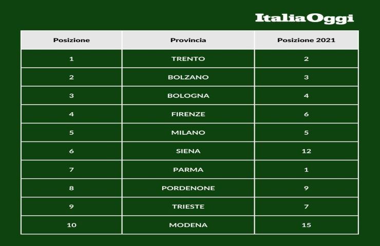 Dopo Trento si posizionano Bolzano e Bologna conquistando una posizione in più rispetto allo scorso anno. Scende, invece, Firenze, classificandosi quarta. Resta stabile Milano al quinto posto seguita da Siena che conquista ben sei posizione (era 12esima nella classificata 2021). Scivolone clamoroso, infine, per Parma in vetta alla classifica lo scorso anno. Per il 2022, invece, si è aggiudicata un misero settimo posto, segno che le cose, in città, stanno cambiando in peggio.