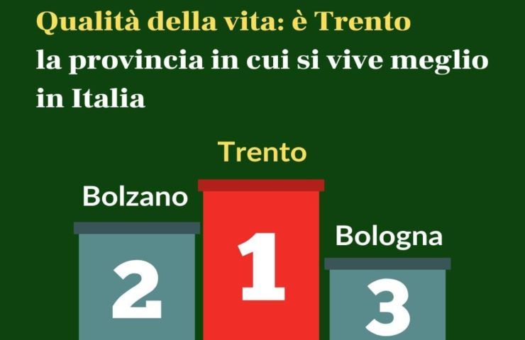 La provincia di Trento la spunta su tutte le altre e si piazza in vetta alla classifica del Rapporto sulla Qualità della vita in Italia risultante vincente in tutti gli ambiti di interesse che sono stati presi in considerazione, otto su nove.