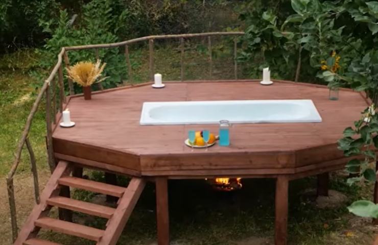 È necessaria una pedana di quelle grandi, scavando una sorta di serpentone al centro, mettendo polistirolo alla base, rete metallica, gesso e colorante per creare l’effetto fino a inserire l’acqua all’interno. Al centro basta sistemare un po’ di muschio, piante grasse e qualche pietra e si ha davanti un vero capolavoro. E se questa sfida non vi basta, con i pallet si può costruire una piattaforma in legno rialzata, con tanto di scaletta, che ospita al centro una vasca dove fare il bagno all’aperto.