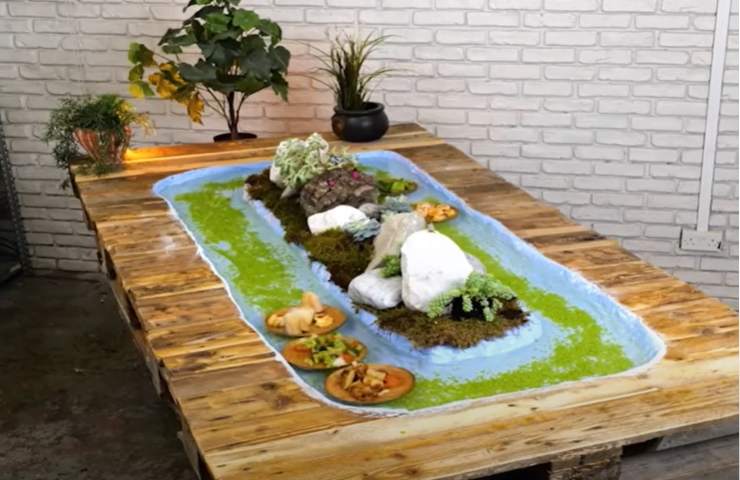Dai lavori più semplici e veloci a vere opere d’arte. I pallet si prestano a realizzazioni davvero diversificate. Le classiche panchine con tavolino annesso per giardino sono alcune delle idee più viste e riproposte ma che non tramontano mai anche perché poi ognuno con colori e decorazioni può arricchirle e personalizzarle. Ma avete mai visto un piccolo laghetto artificiale realizzato con i pallet che arricchisce il tavolo dove mangiare e fa da “rullo” trasportatore?