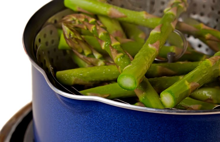 - La prima cosa che devi fare risulta essere quella di pulire gli asparagi recidendo la base, dopodiché lavali bene e trasferiscili all’interno di una pentola alta con il cestello per la cottura al vapore.
